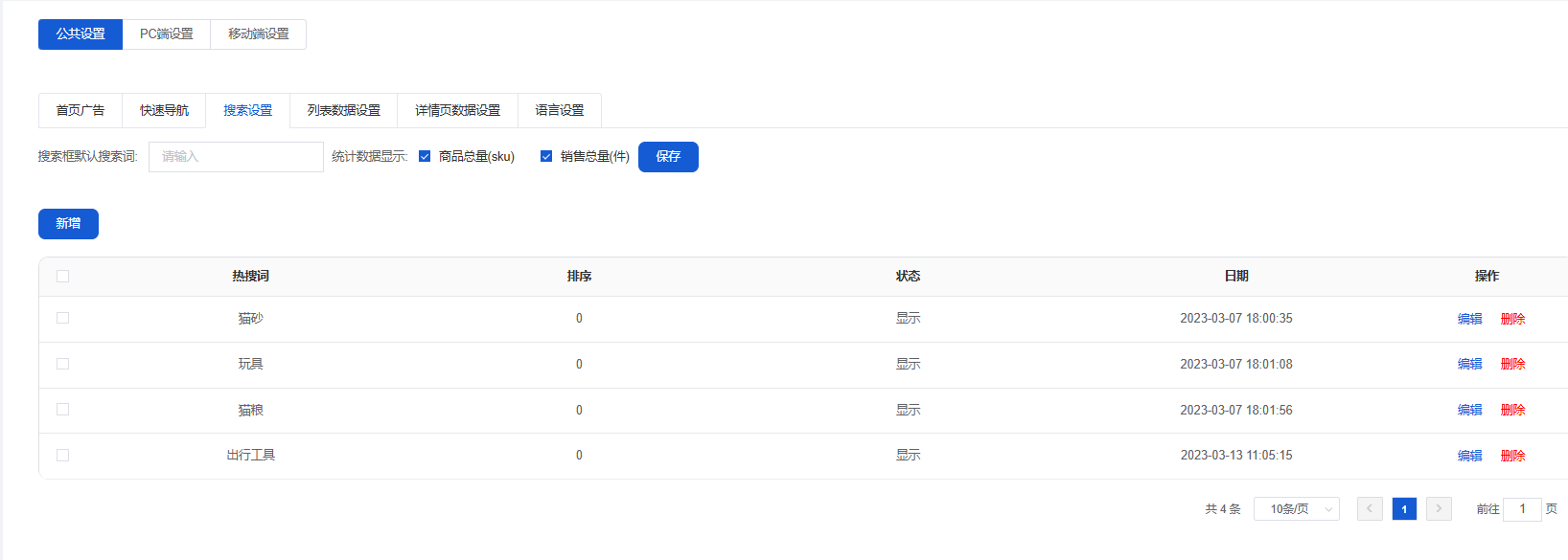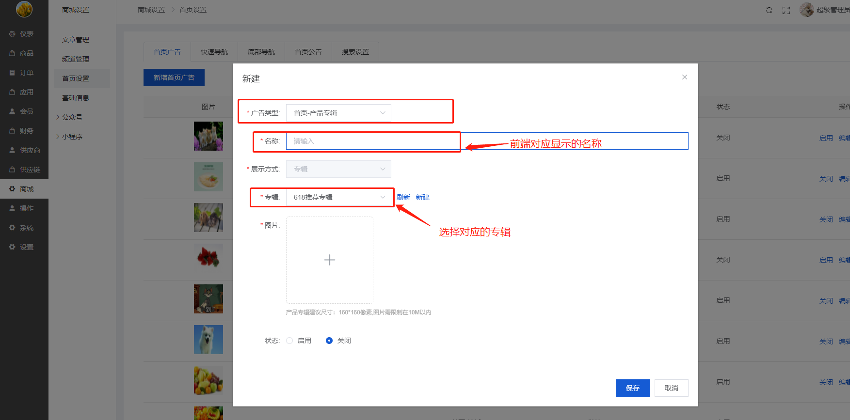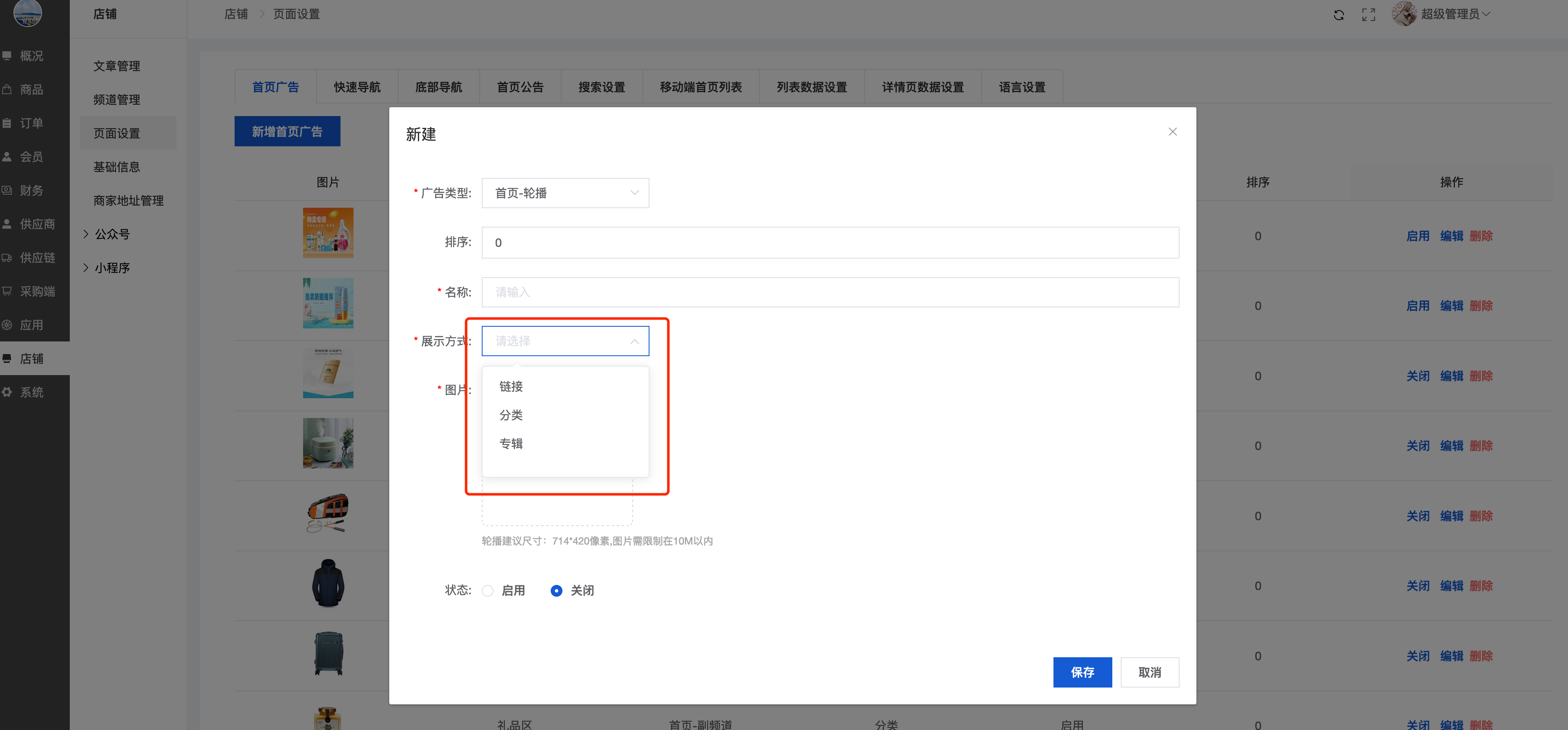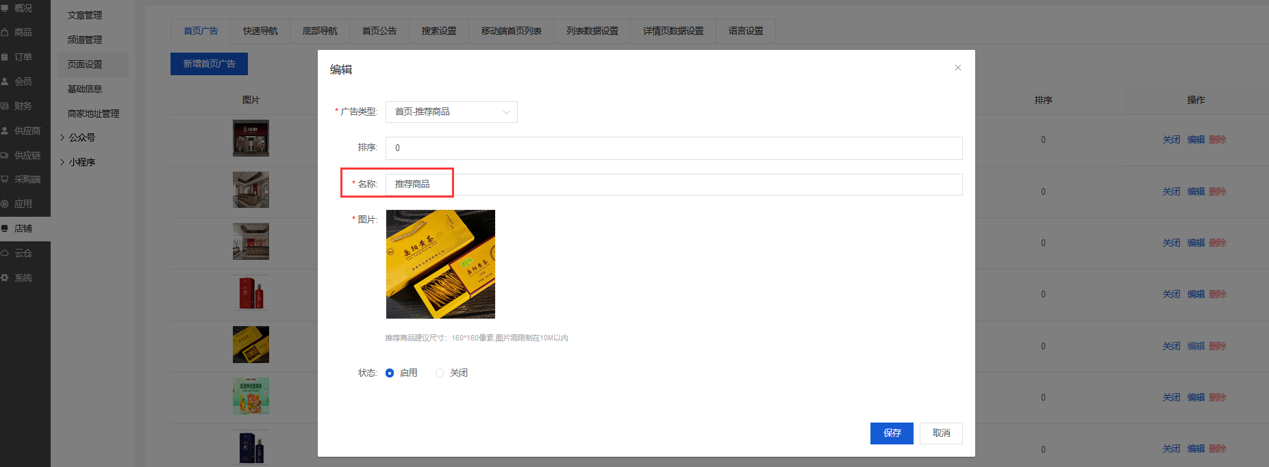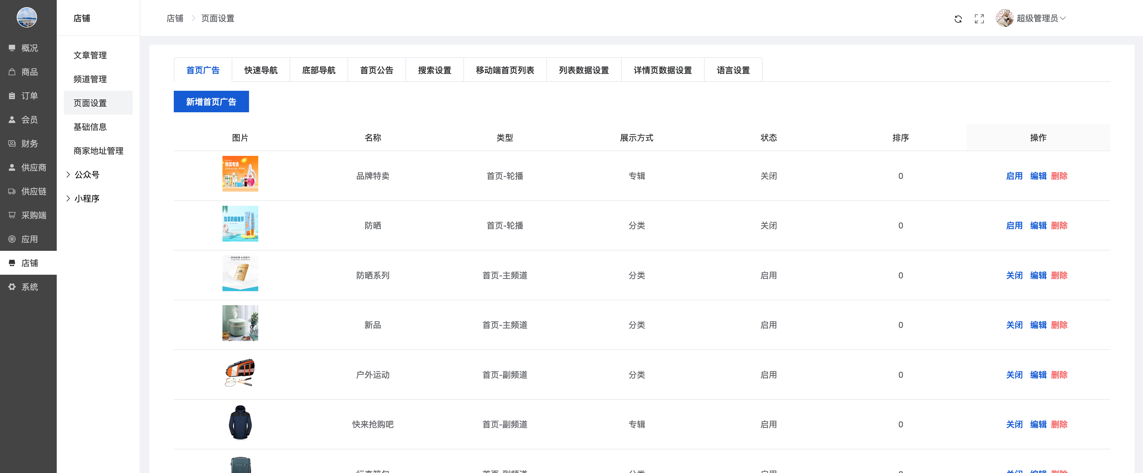 可以新增/编辑首页广告、关闭/开启/删除首页广告(前端只显示开启的首页广告)