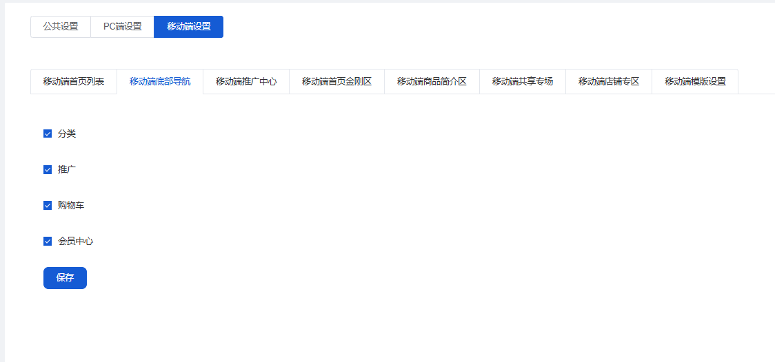 【分类】分类是广告跳转到分类数据,选择分类后,广告跳转就会跳到分类数据页面;注:分类数据前往商品-分类管理进行设置;