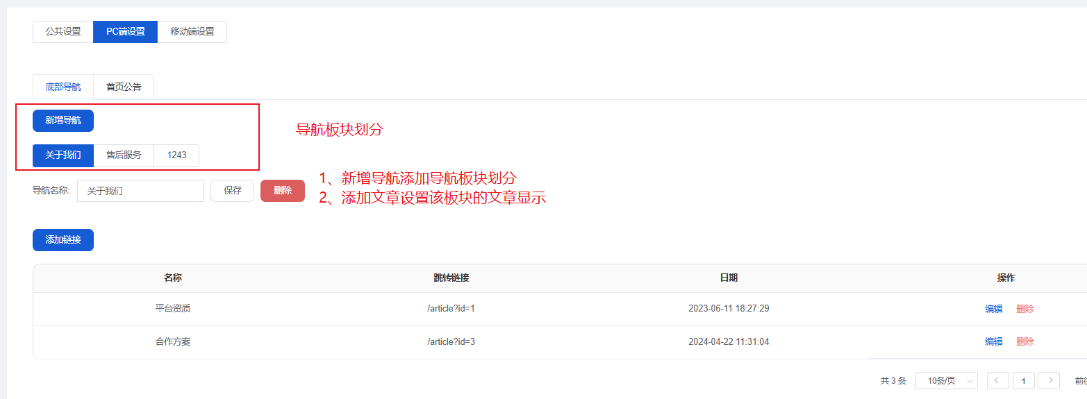 4)链接地址数据根据需要放置内容去设置,如需要放置文章链接,则前往【文章管理】模块添加。