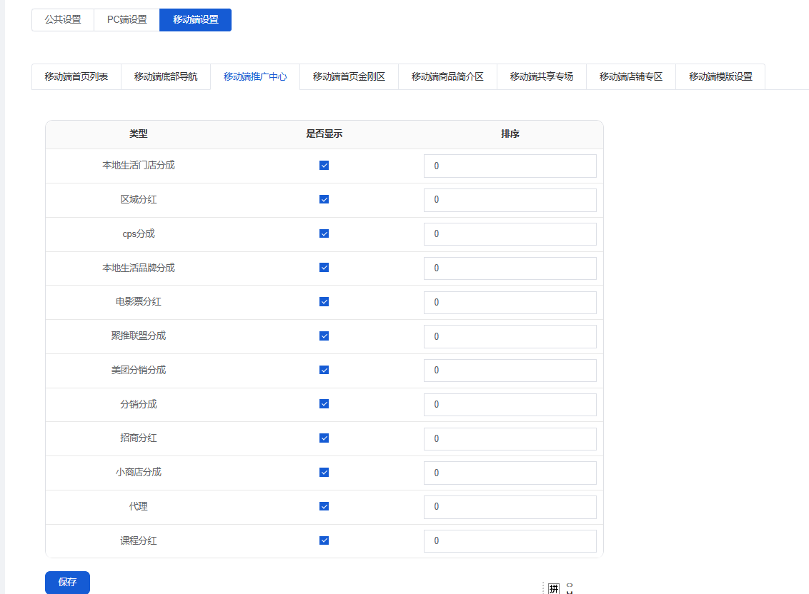 勾选是否显示,可设置排序,数字越大排得越前面