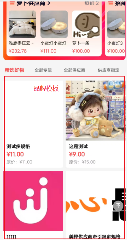 支持后台自定义设置,设置路径:店铺–首页设置–移动端首页列表列表自定义名称、数据:数据包括:全部商品、指定分类、营销属性、指定专辑;排序:数字大的显示在前面移动端首页商品列表,如下图:
