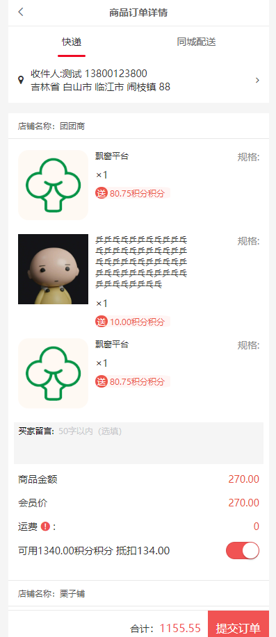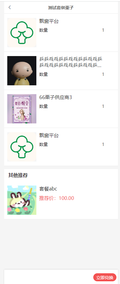 选择样式1,前端点击立即兑换,下单套餐设置的所有商品,若商品有规格则默认第一个规格 。提交订单页面也不显示单个商品的价格,只显示总价格,如下图