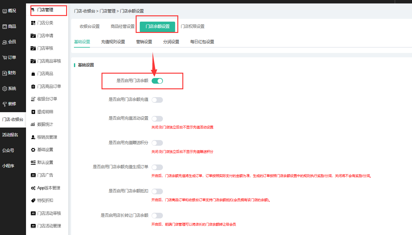 1) 门店余额开关:开启该门店才能使用门店余额功能,前端门店首页才会显示门店余额,支付方式处才会显示门店余额支付