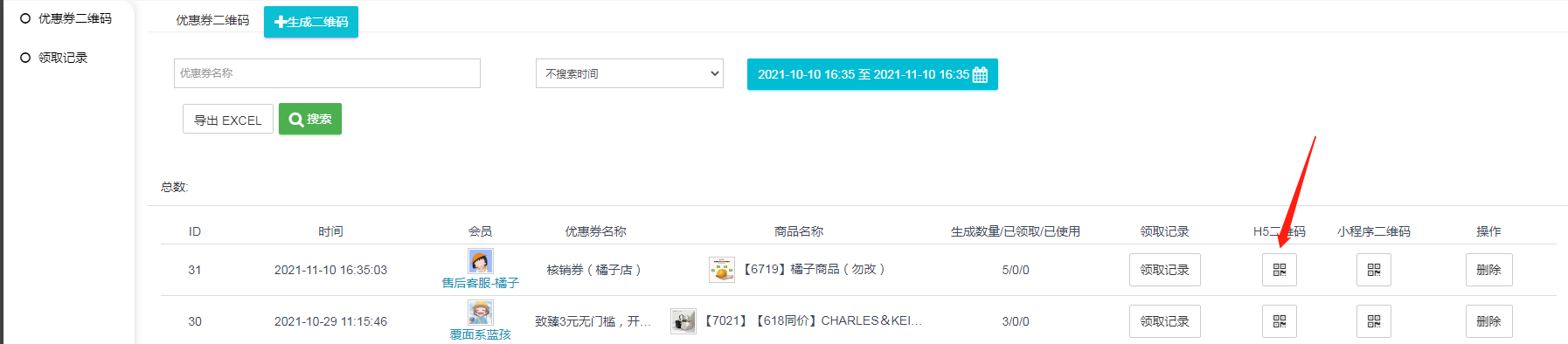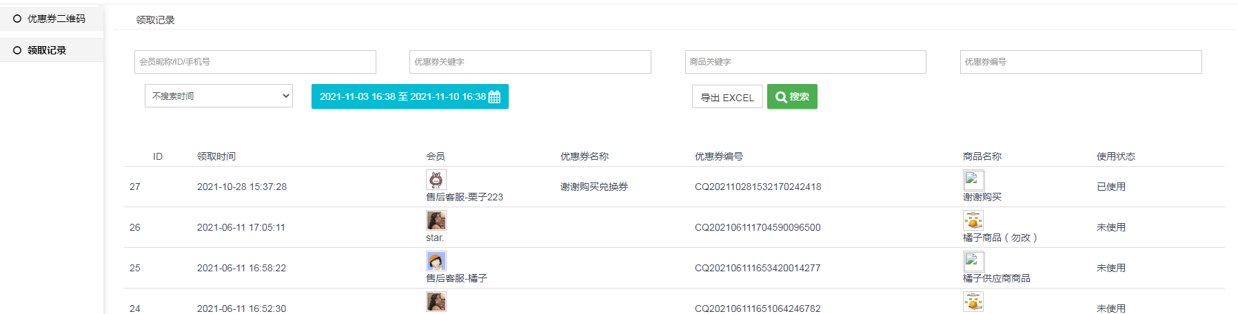 可以看到会员领取时间和使用记录,可以按优惠券关键字,商品关键字,优惠编号等条件来筛选查看