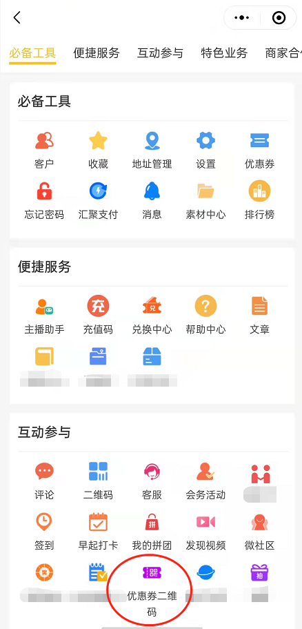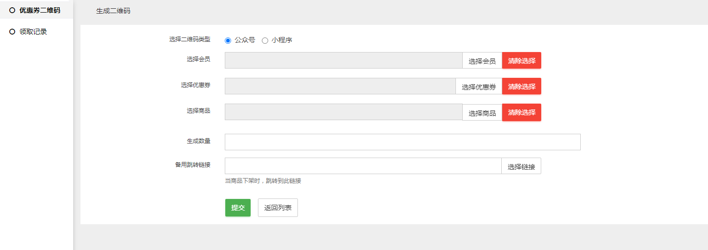 选择二维码类型,选择会员,优惠券,商品(支持选择平台、门店的商品,不支持聚合供应链、供应商、酒店、租赁和语音的商品