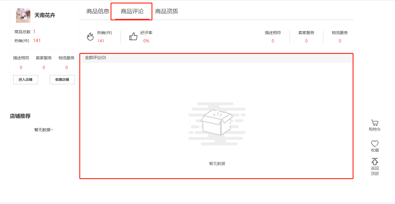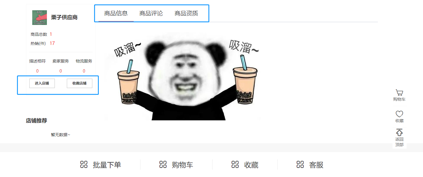 2.商品详情——展示:店铺信息、商品信息、商品评论、进入店铺、收藏店铺、商品资质、店铺推荐;