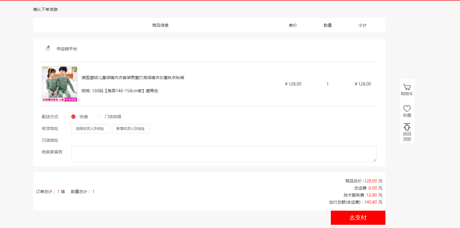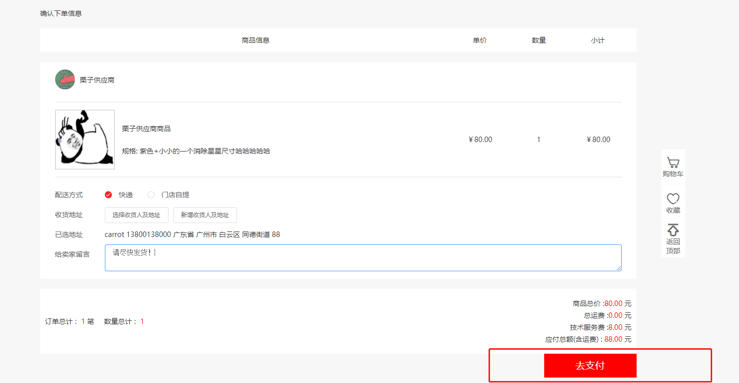 6.选择配送方式,收货地址,留言,之后点击去支付;