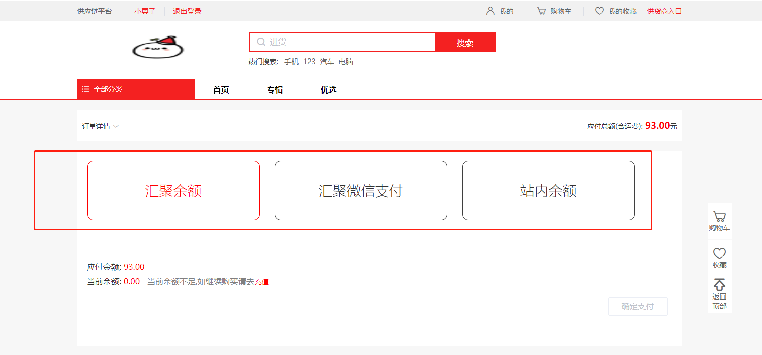 7.可以选择汇聚余额、汇聚微信支付、站内余额的支付方式;汇聚微信支付,需要手机扫码进行支付;如果使用余额支付,余额足够可直接点击确定支付即可,如果余额不够可点击充值进行充值之后再进行支付。