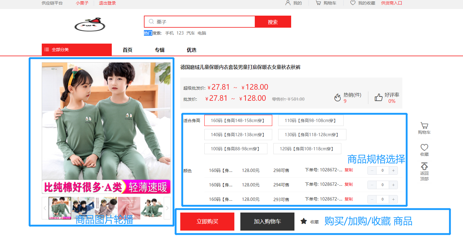 1.商品详情——操作:立即购买、加入购物车、收藏商品、选择规格、查看商品轮播图;