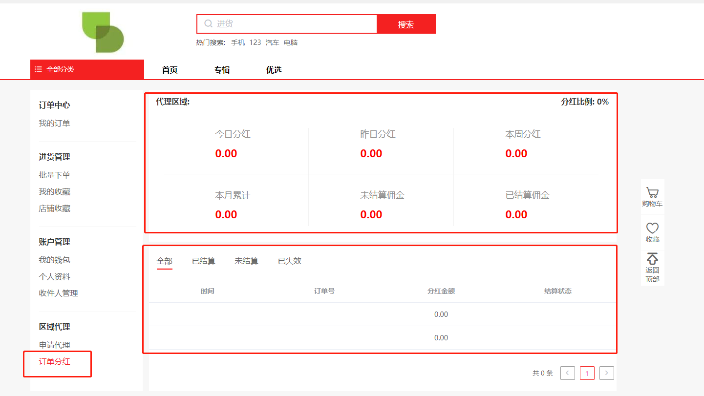 2)订单分红:可以显示当前等级的分红比例,查看各时间段分红(今日、昨日、本周、本月)、未结算佣金、已结算佣金,以及各分红订单的订单号和结算状态等;