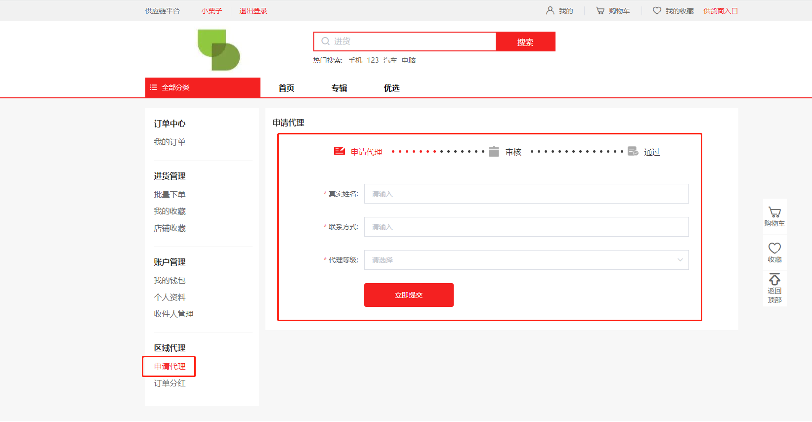 1)申请代理:点击“申请代理”,填写姓名,联系方式,选择代理等级,然后点击“立即提交”,可以提交成为区域代理的申请,等待后台审核;