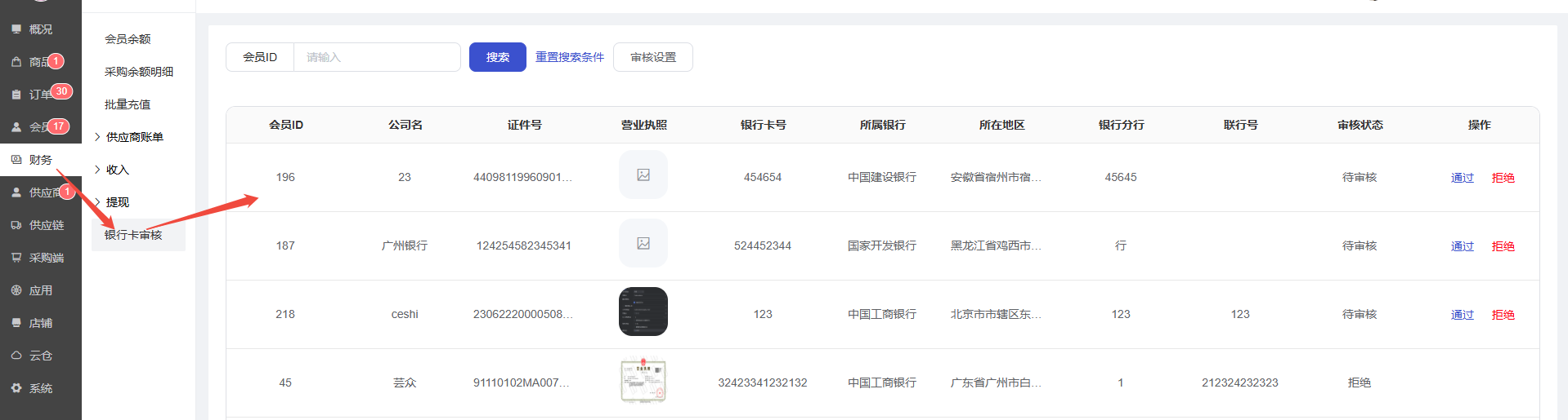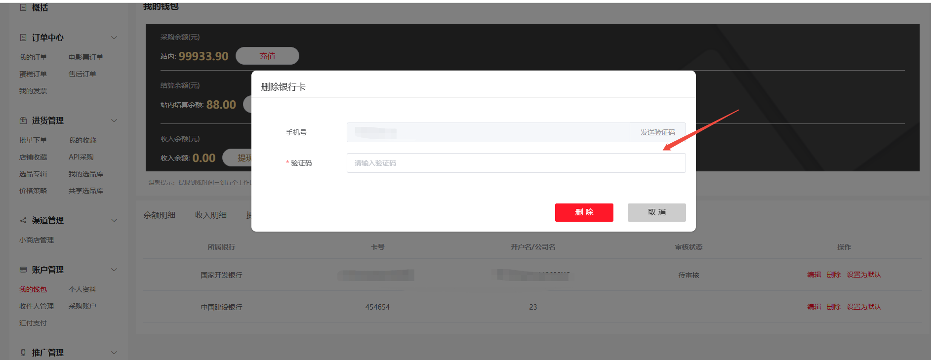 新增编辑或删除绑定的银行卡,需要获取绑定的手机号验证码,才可以操作,并需要后台审核,如图:
