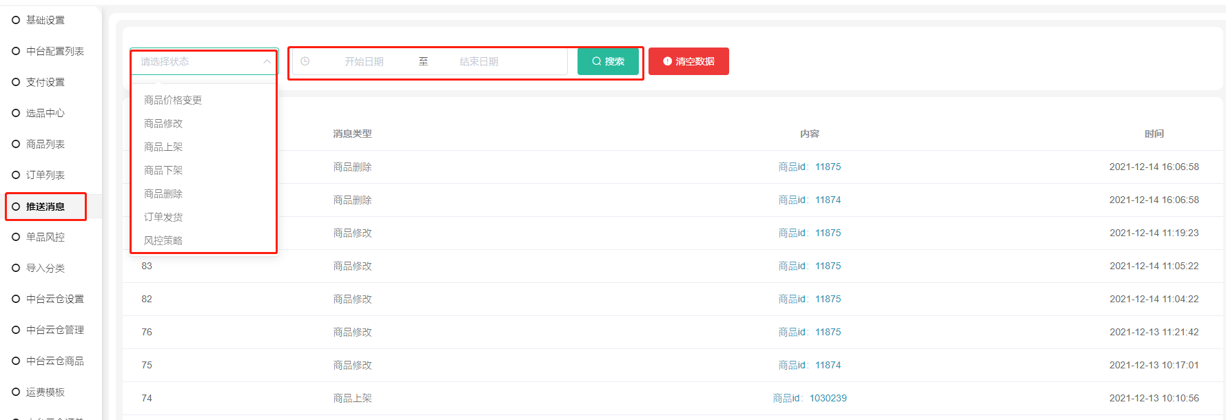8.推送消息作者: aishidai / 2025年11月21日 推送订单发货、商品修改等信息,可以按消息类型,推送时间搜索查看/清空对应消息; 目前只有这三个筛选的,没有上下架/价格变更/删除的因商品更新上下架记录太多了,商品更新上下架 数据量太大占内存,可以直接到商品列表筛选查看已下架商品~