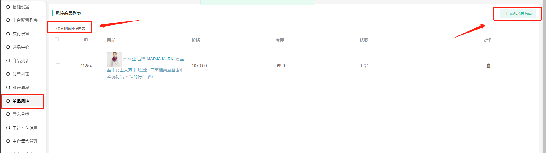 可操作添加风控商品,或批量删除风控商品;