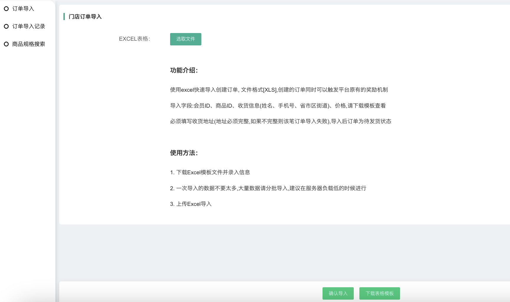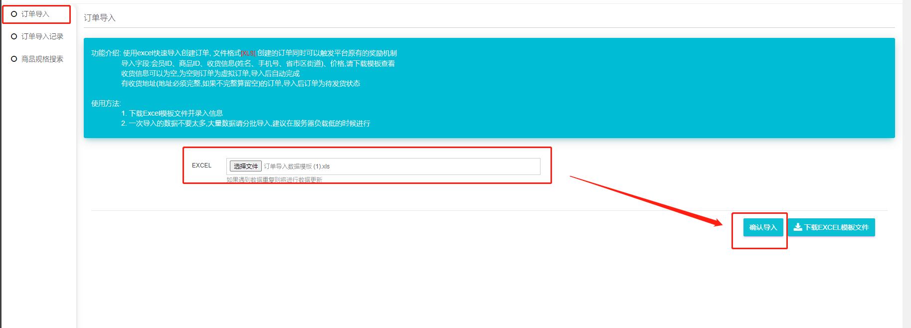概述:通过EXCEL表格的形式批量导入订单到指定会员名下,触发私域平台营销分润功能。导入表格后,系统自动创建订单,创建的订单可以触发分润机制,比如分销奖励、经销商奖励等。