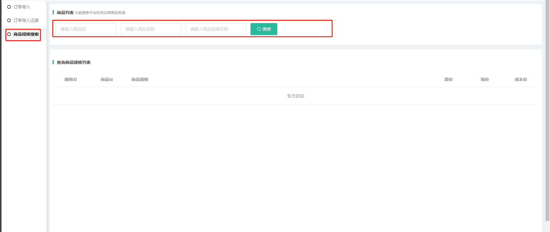 可以按商品ID、商品名称、商品规格名称,搜索商品,注:只能搜索平台和供应商商品规格;