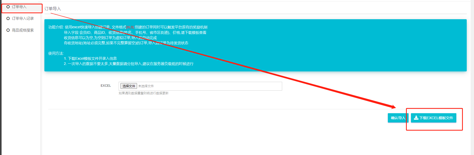 2、打开下载好的模板表格,本地编辑好表格内容,如果商品有启用多规格,可在下方“商品规格搜索”查找商品规格的ID,填写正确ID。通过订单导入功能,选择对应表格,确定导入;