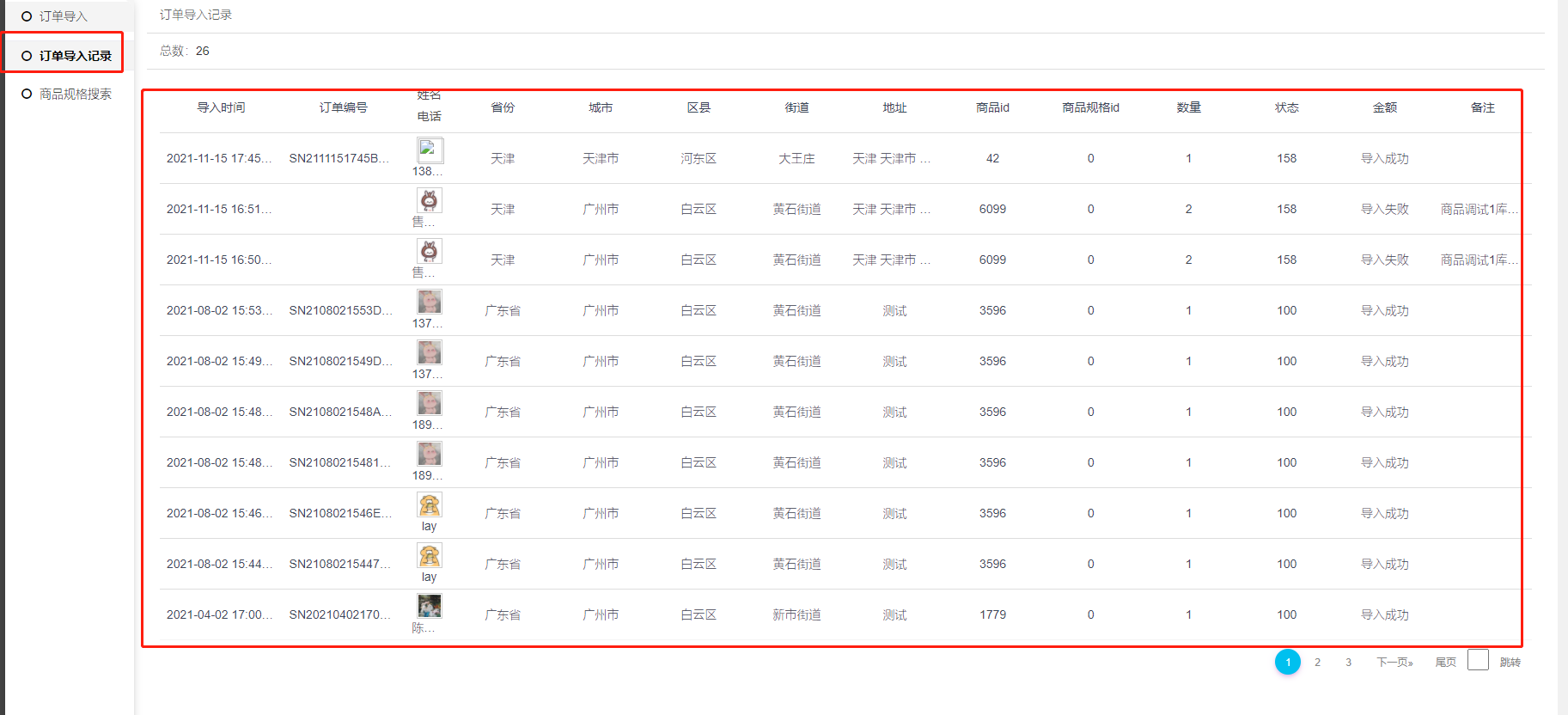 订单执行导入后,在商城后台订单管理中,可看到导入的订单;在订单导入插件–订单导入记录中,也可以看到导入的记录信息。