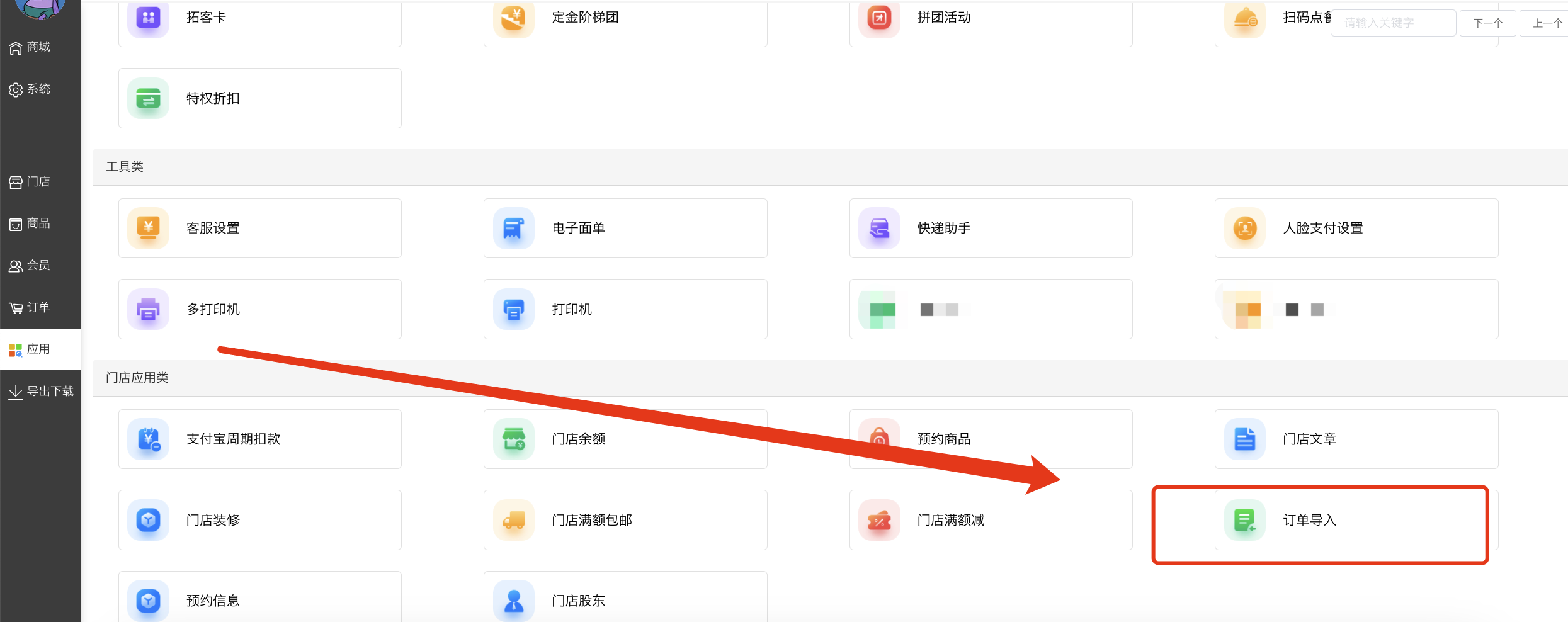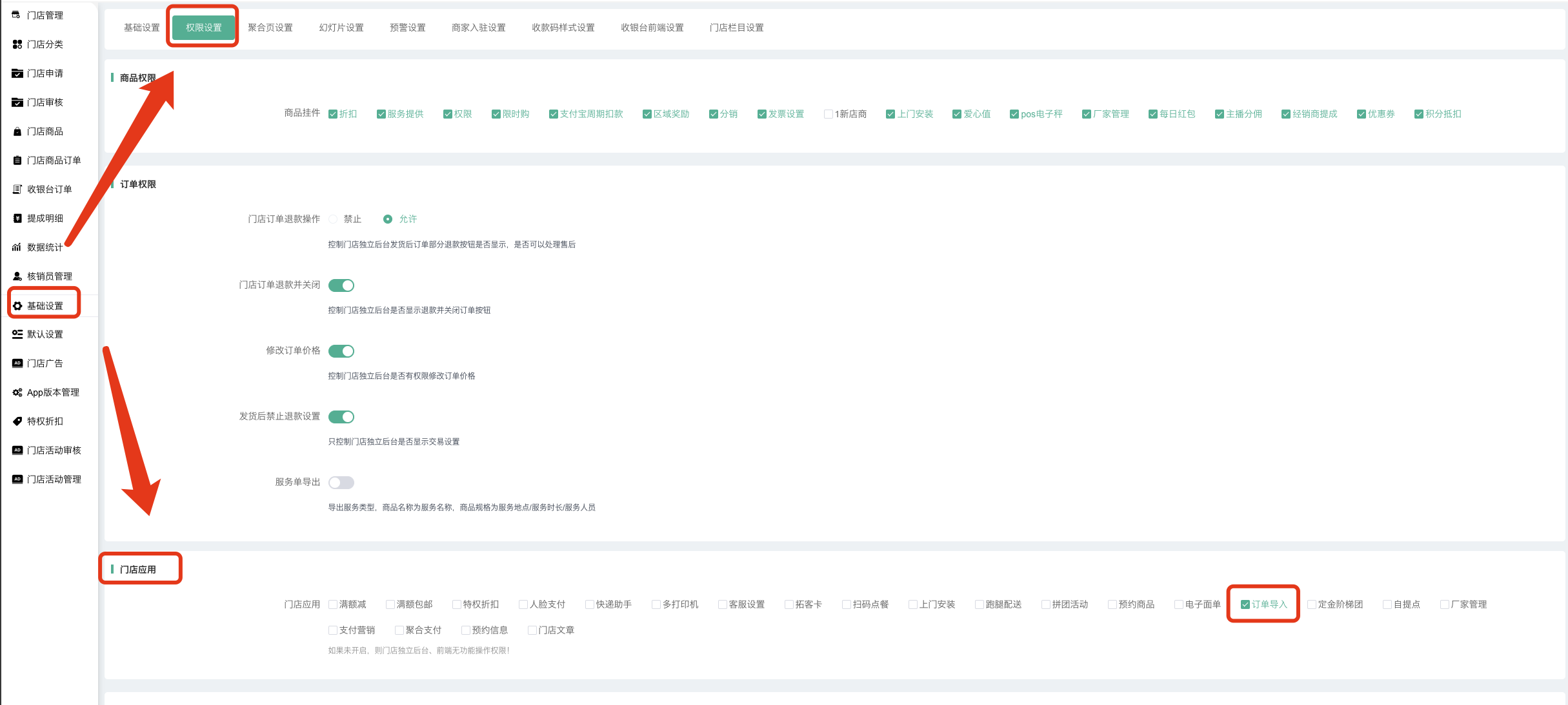 (一)总后台进入门店收银台插件,在基础设置 — 权限设置 — 门店应用那勾选订单导入,如果未勾选,则门店独立后台没有操作权限,也不会有显示。