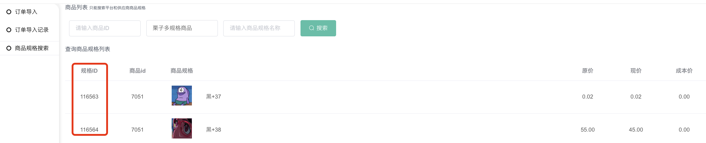 比如搜索商品名称,可搜索规格ID,显示如下。