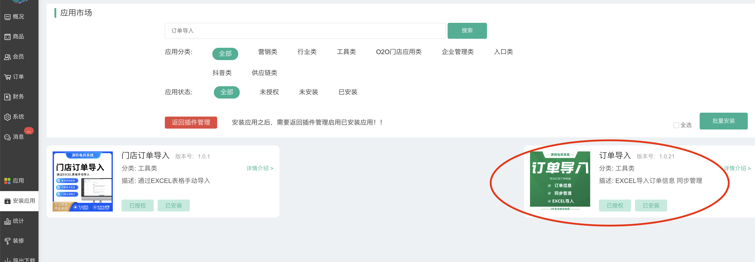 安装路径:商城后台 — 安装应用 — 安装订单导入