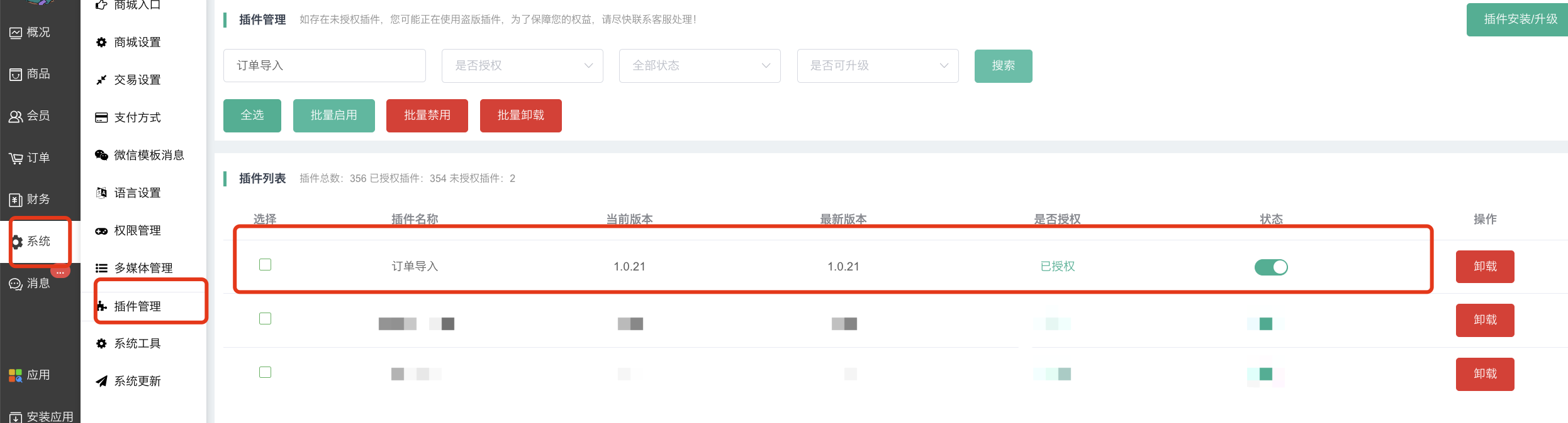 安装后启用路径:商城后台 — 系统 — 插件管理 — 启用订单导入