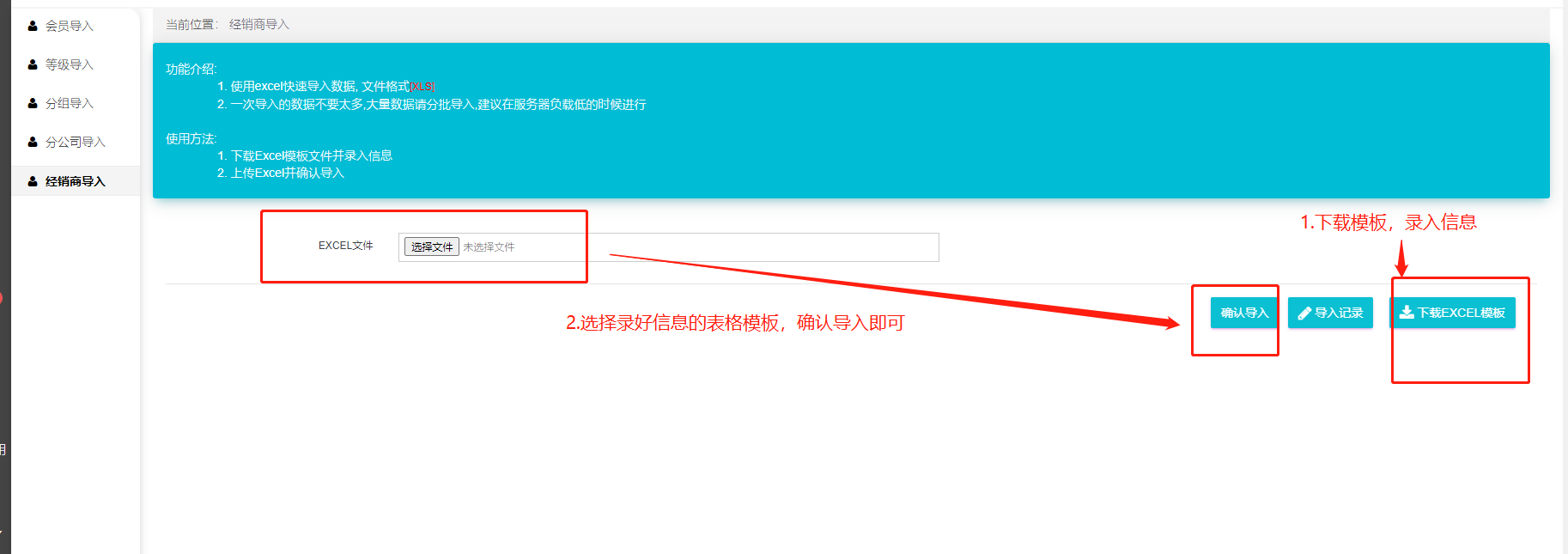 一、功能简述:通过表格批量导入会员、会员等级、会员分组、分公司、经销商;