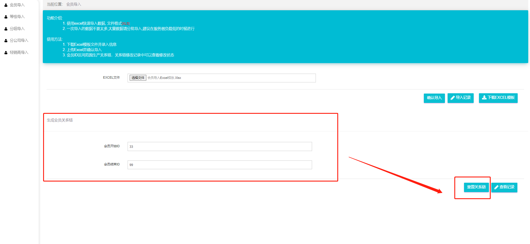 举例说明:导入了会员ID33~99,导入时有设置上级,但是导入后关系链表里不会有这条关系链,需要输入33和99,重新生成一下这段会员的关系链。