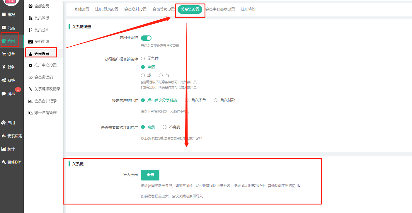 使用会员导入,有个生成会员关系链,使用方法如下: