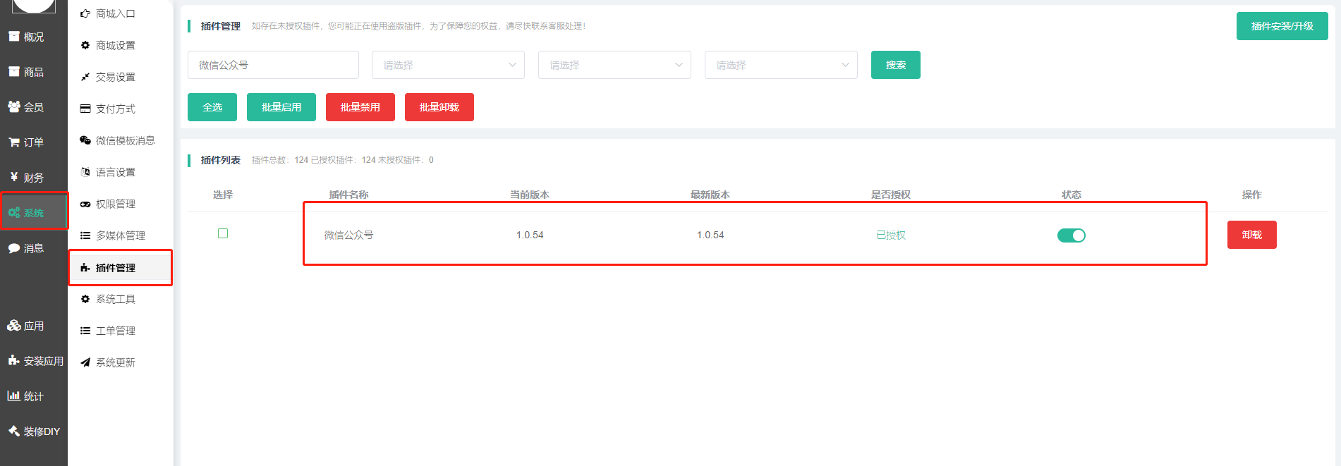2、创建平台后,点击“管理”进入系统后台,通过系统–插件管理–开启“微信公众号”