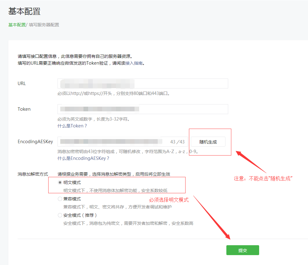 复制商城后台的服务器URL、token、AESkey的信息,粘贴到微信公众平台–设置与开发–开发接口管理–基本配置–服务器配置–修改配置,请对应粘贴。必须显示【提交成功】才是正确的喔。