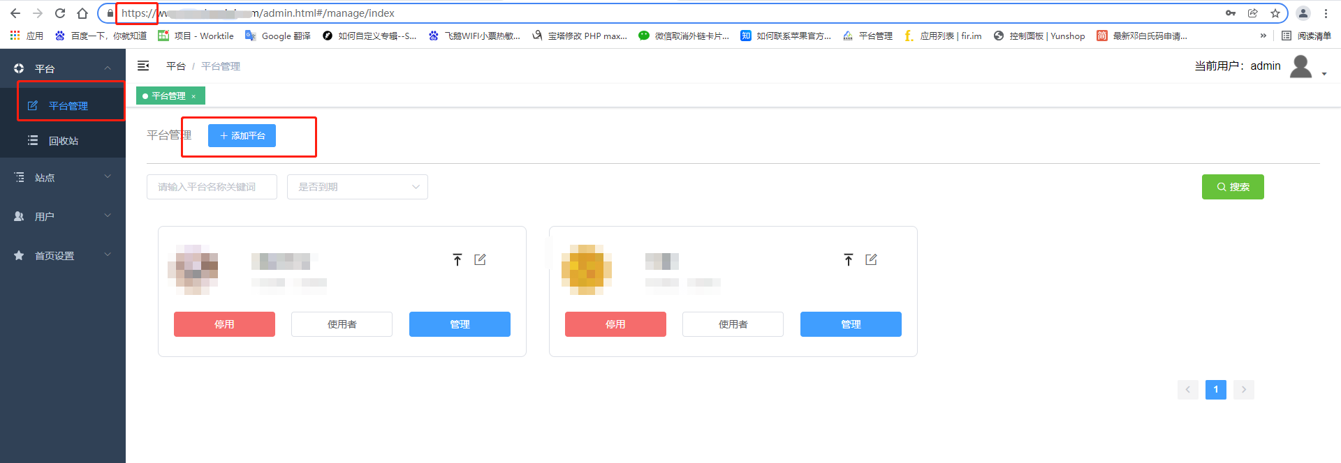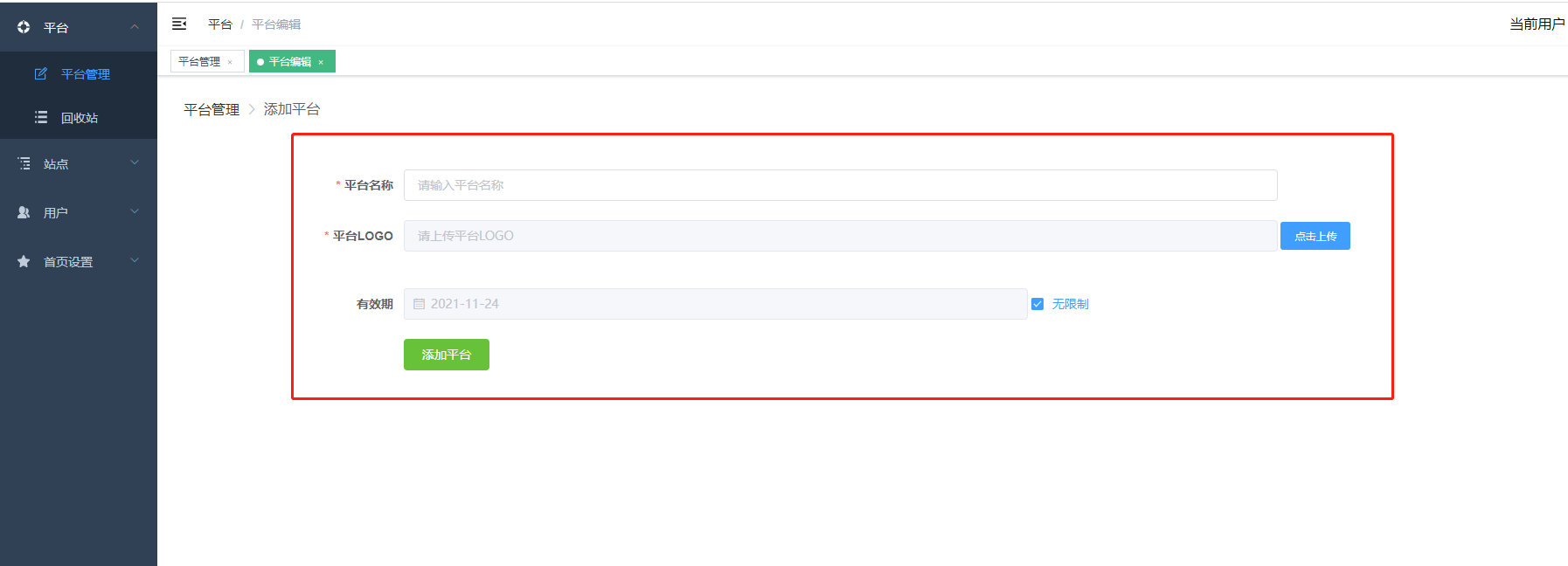 1、首先登录商城后台(请以https://的形式访问商城后台),点击左侧菜单“平台管理”,点击“添加平台”,输入平台名称和上传logo