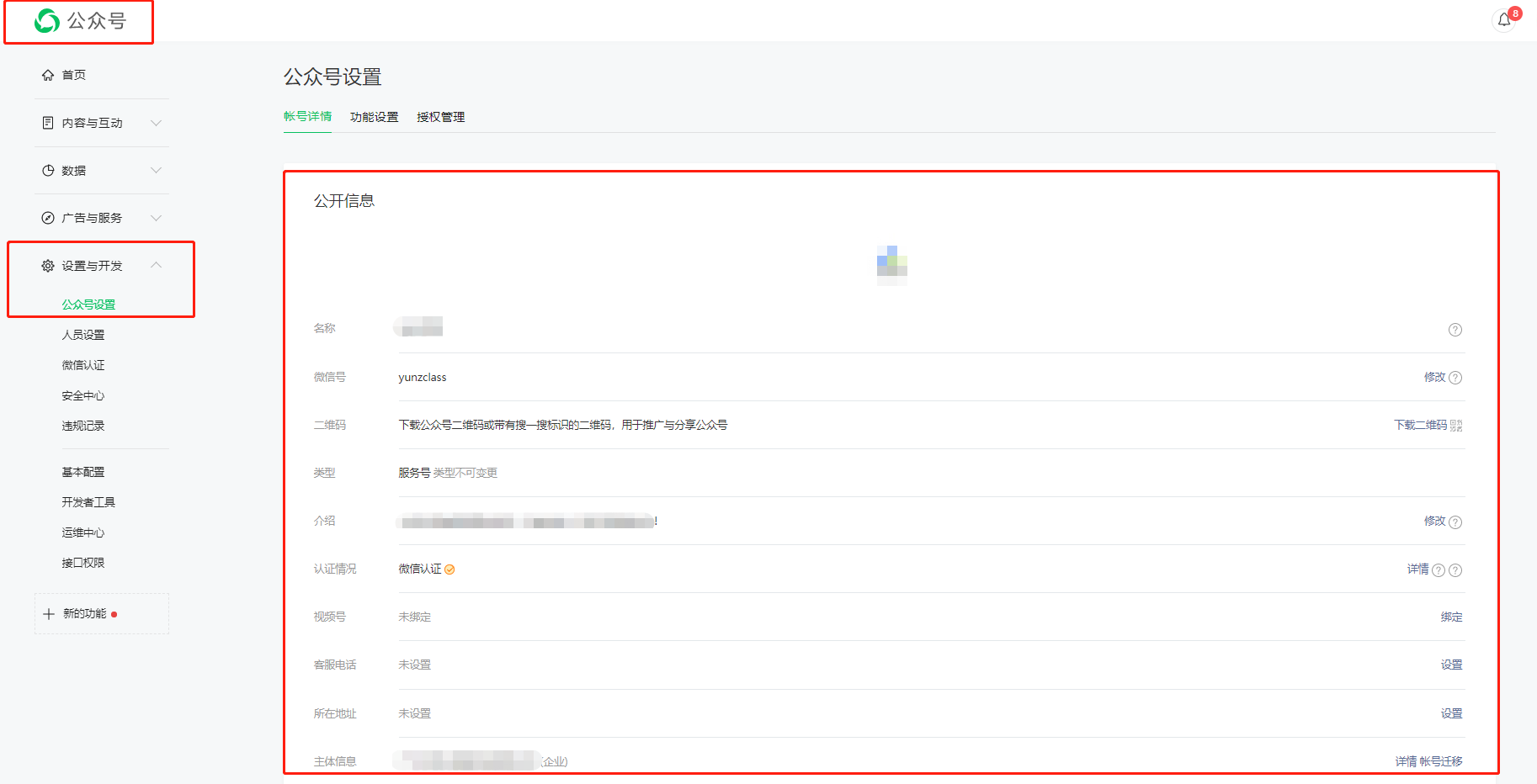 5、公众号APPID、APPsecret两参数,在左侧菜单“设置与开发–开发接口管理–账号开发信息获取开发者ID(AppID)和开发者密码(AppSecret)。