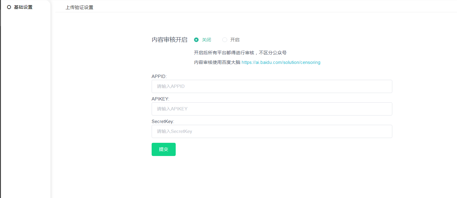 后台内容审核开启,需要到百度大脑中获取APPID,APIkey和secretkey,填写在后台基础设置这里即可.