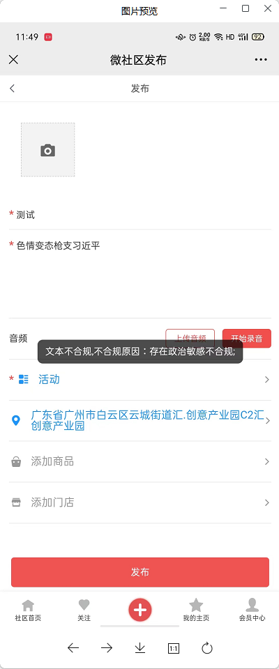 举例:微社区发布帖子若含有不合规内容会触发给出提示不合规