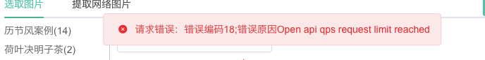 若上传图片提示请求错误:错误编码18;错误原因open api qps request limit reached(如下图),意思是已达到打开api qps请求限制,说明申请的内容审核api额度已经用完了,需付费购买。更多详情可看https://ai.baidu.com/ai-doc/ANTIPORN/Wkvuvexbj
