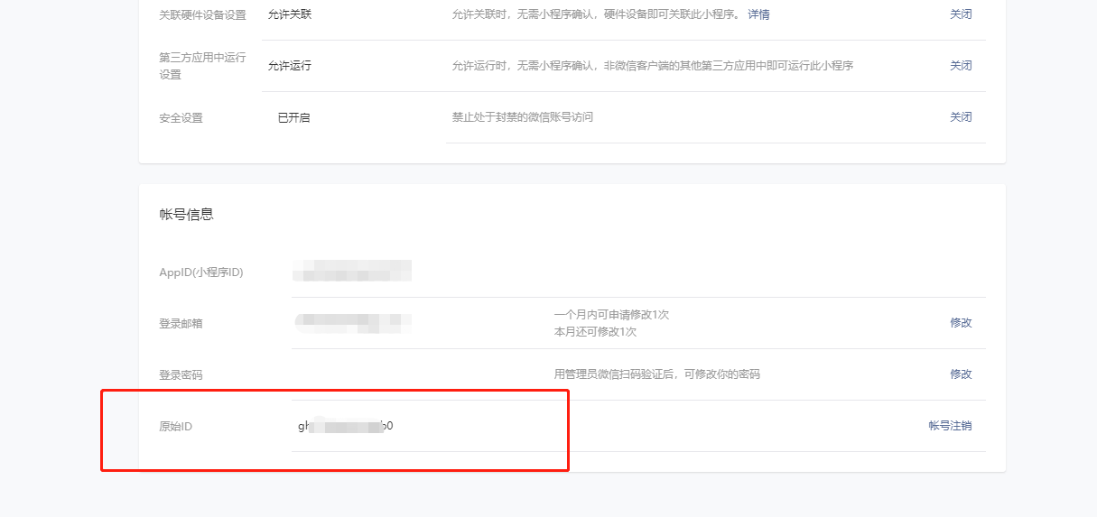 获取小程序原始id的路径:在小程序平台 ==> 设置 ==> 基本设置 ==> 账号信息,查看复制原始id