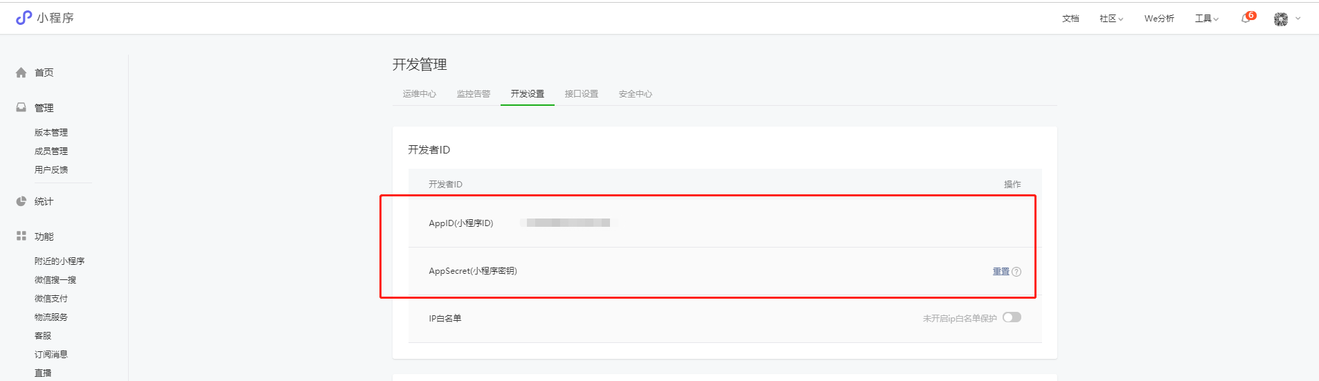 获取appid和Appsecret的路径:登录小程序平台mp.weixin.qq.com ==> 开发管理 ==> 开发设置 ==> 获取小程序appid;小程序Appsecret需要生成时(需要管理员微信扫一扫扫码,不能长按识别)才能获取到,仅生成时可以查看获取,确定后不再支持查看,除非重置过。