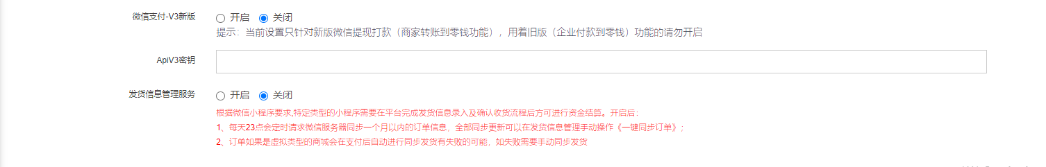 3、微信支付-V3新版:当前设置只针对新版微信提现打款(商家转账到零钱功能),用着旧版(企业付款到零钱)功能的请勿开启,如开通商家转账到零钱功能的,通过小程序提交申请打卡的需要配置好,反之不能进行打款~