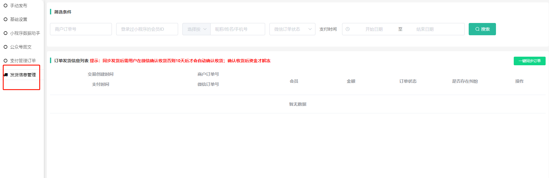 1、每天23点会定时请求微信服务器同步一个月以内的订单信息,全部同步更新可以在发货信息管理手动操作《一键同步订单》;