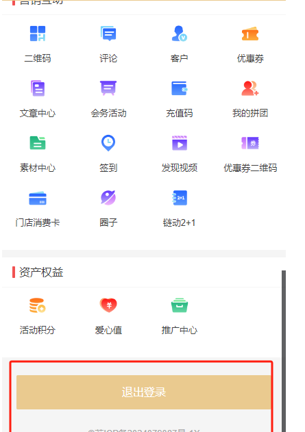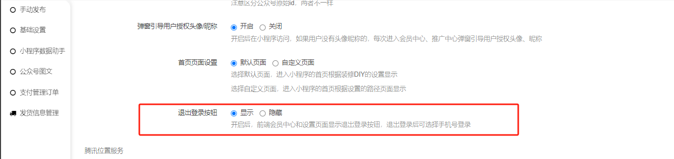 6)退出登录按钮:开启后,前端会员中心和设置页面显示退出登录按钮,退出登录后可选择手机号登录(手机号需绑定有商城微信会员的手机号登录,不能直接使用单手机号会员)