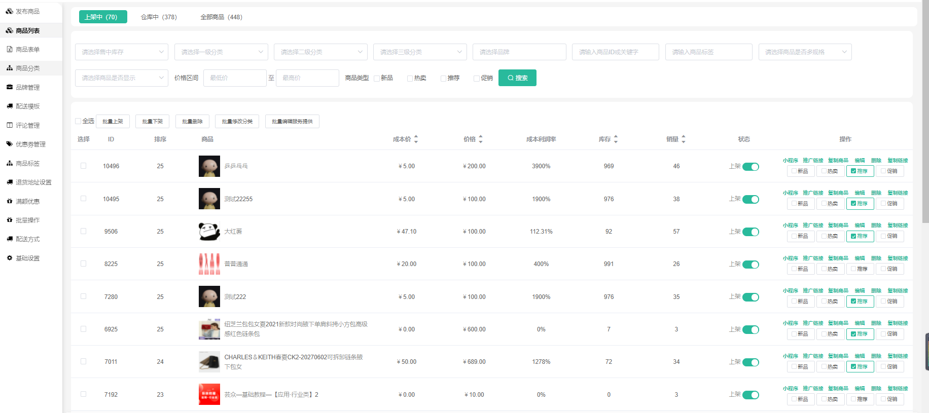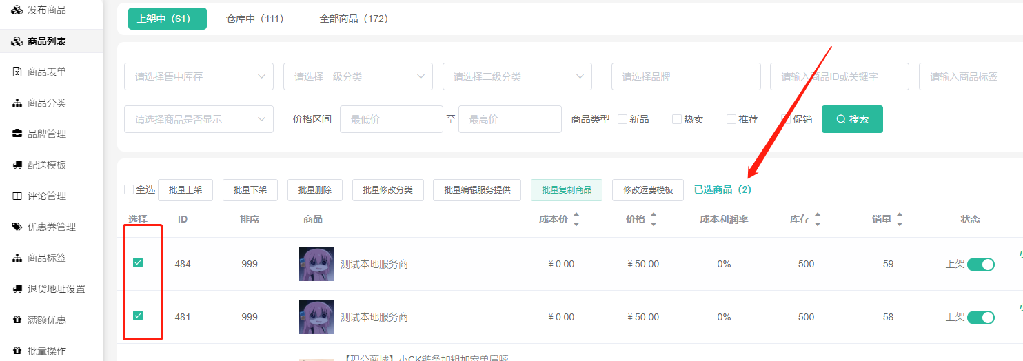 批量上架、下架、删除商品,修改分类,批量编辑服务提供,批量复制商品,批量修改运费模板