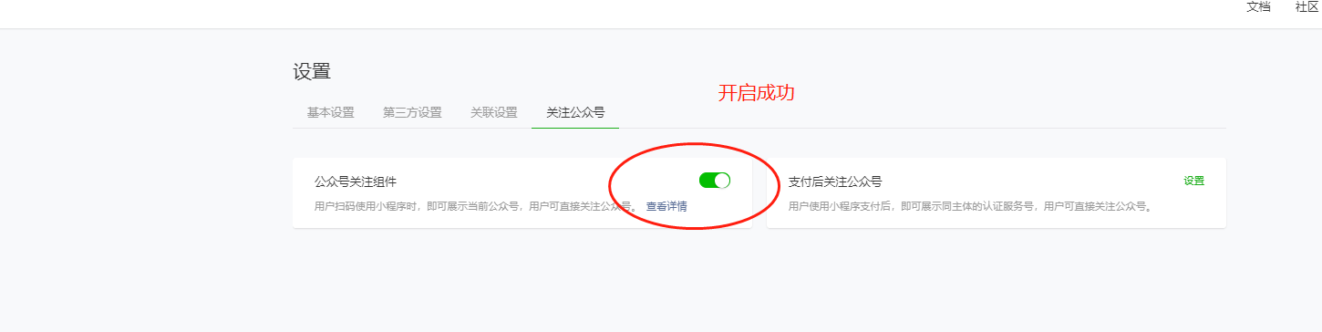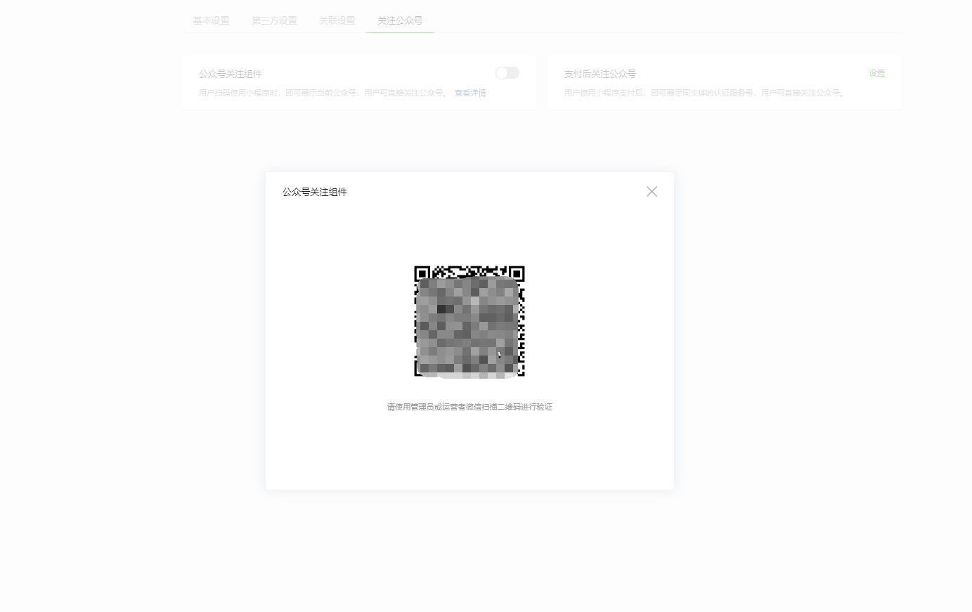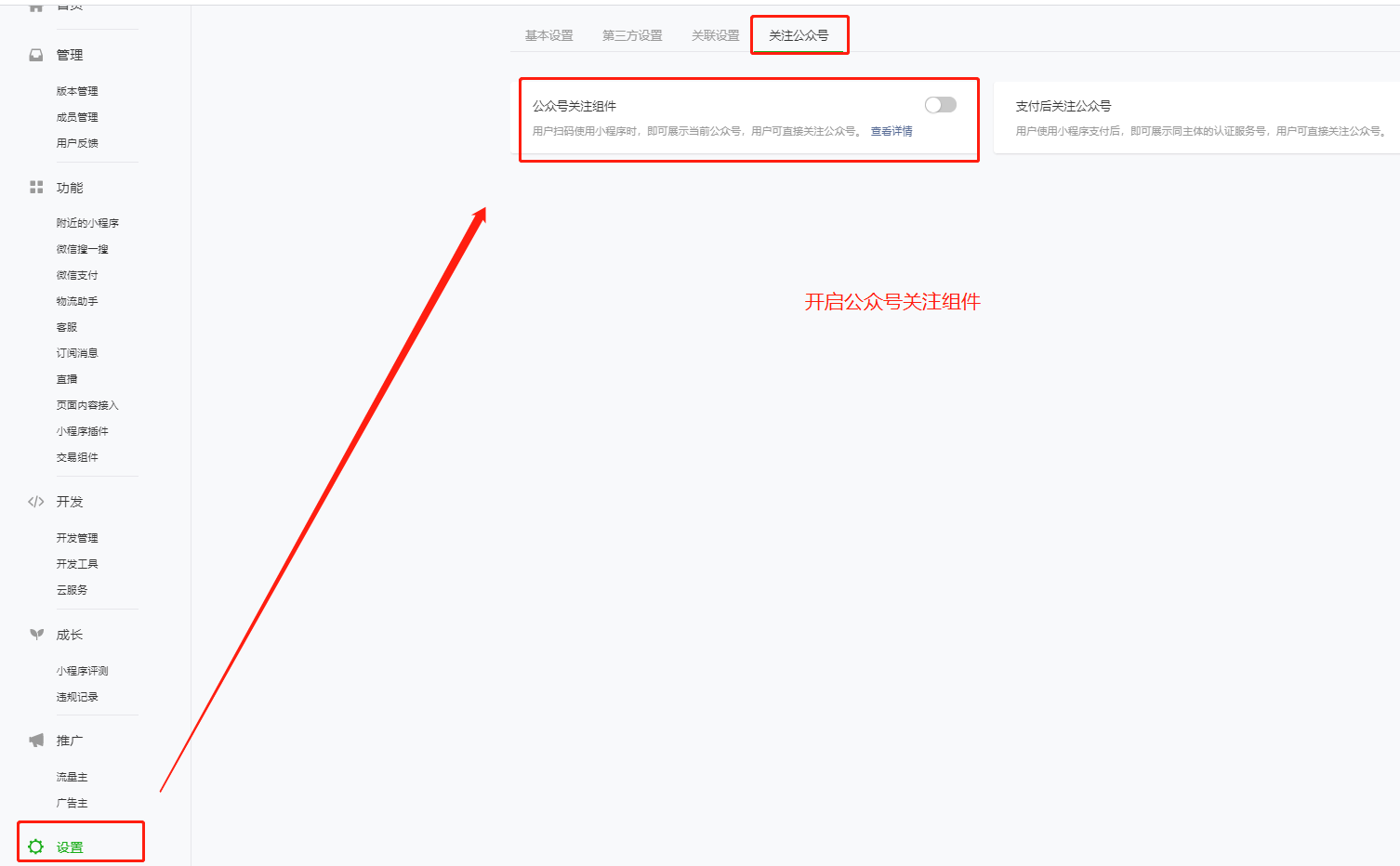 1、登录小程序mp.weixin.qq.com平台 — 设置 — 关注公众号 — 开启公众号关注组件