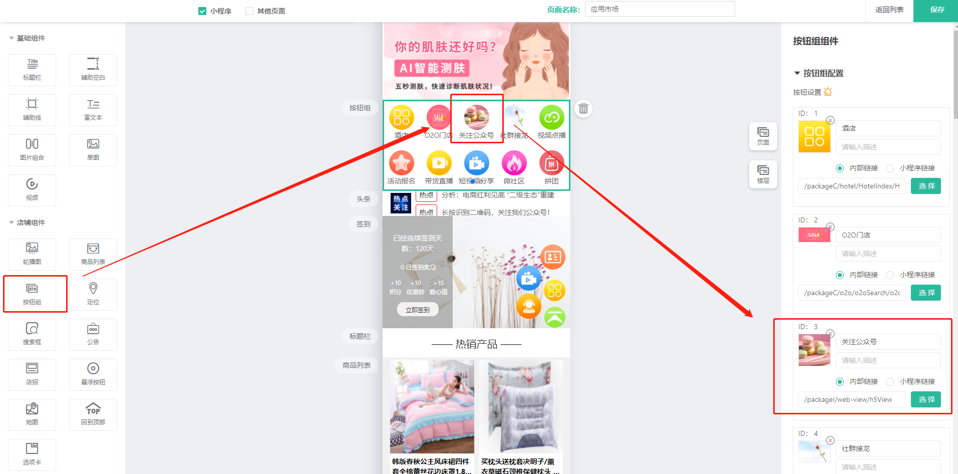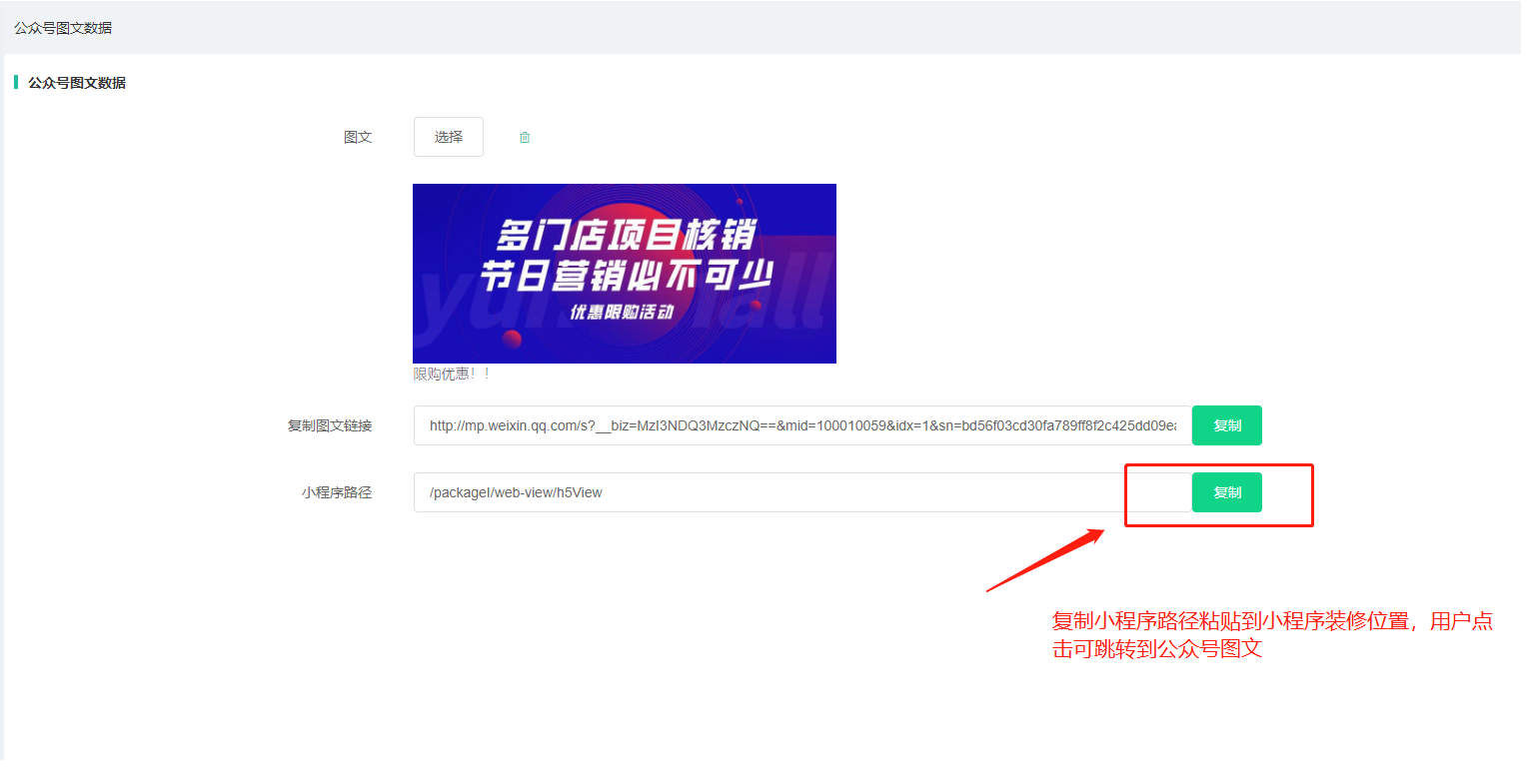 5、选择图文后,确认提交,复制小程序链接粘贴到小程序装修组件位置(可首页装修组件、个人中心装修组件),用户在小程序商城点击可直接跳转到文章页,点击关注公众号