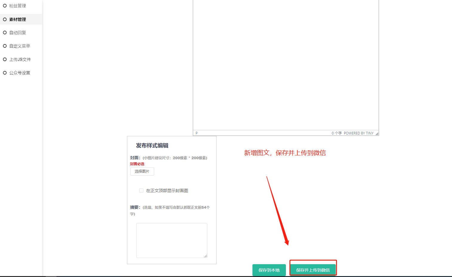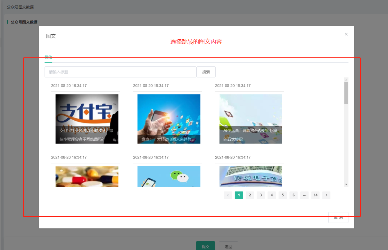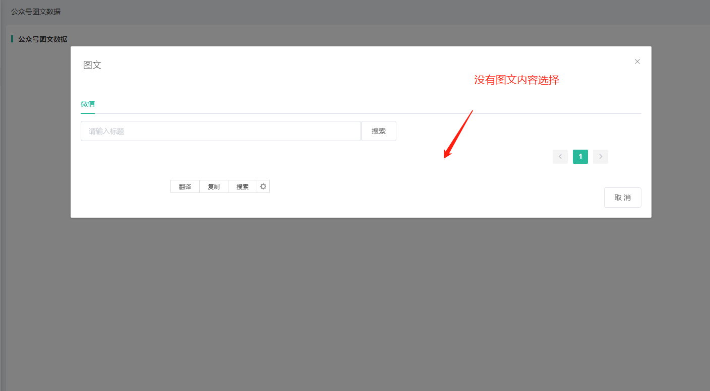 有些客户在选择图文时发现图文数据为空,没有可以选择的,出现原因有两点:(1)商城还没同步公众号图文素材,或者商城后台创建的图文并未‘保存并上传到微信’,只是保存到本地而已。(2)公众号没图文,或商城后台还没创建素材图文。