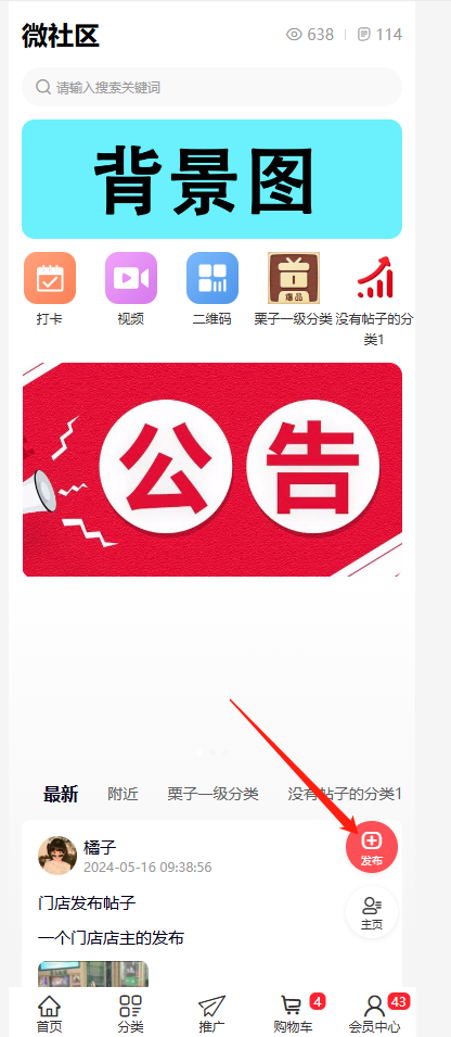 商城会员可以进入会员中心,在营销互动进入微社区,发布帖子。如下图所示。注:如果个人中心没显示微社区,说明平台还没启用微社区插件,或者已启用插件但基础设置并未开启,开启之后,方能显示。若个人中心是启用diy装修,基础设置开启插件后,新创建一个会员中心页,便可有显示。