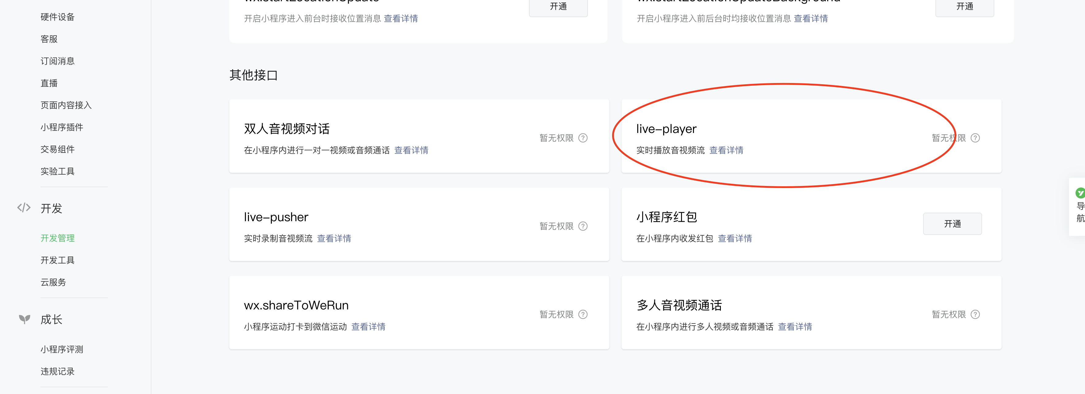 该权限要求小程序具备指定的类目才能开通,对应的类目对资质的要求较高,如需要小程序运营带货直播,请务必要注意查看是否具备权限。https://developers.weixin.qq.com/miniprogram/dev/component/live-player.html