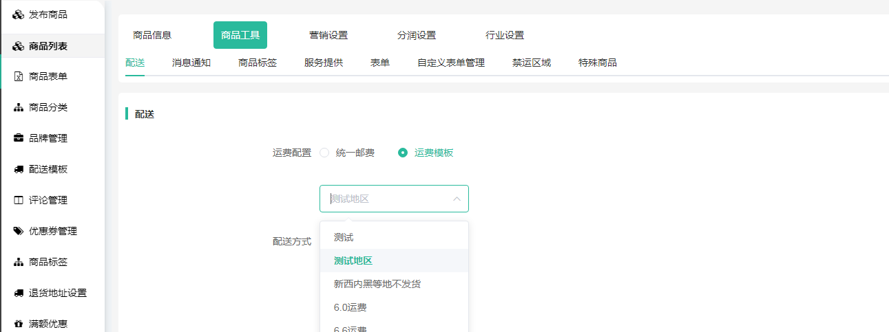 3、运费模板:选择相应的运费模板,即可指定该商品,可配送至相应区域,并按规则收取相应运费;