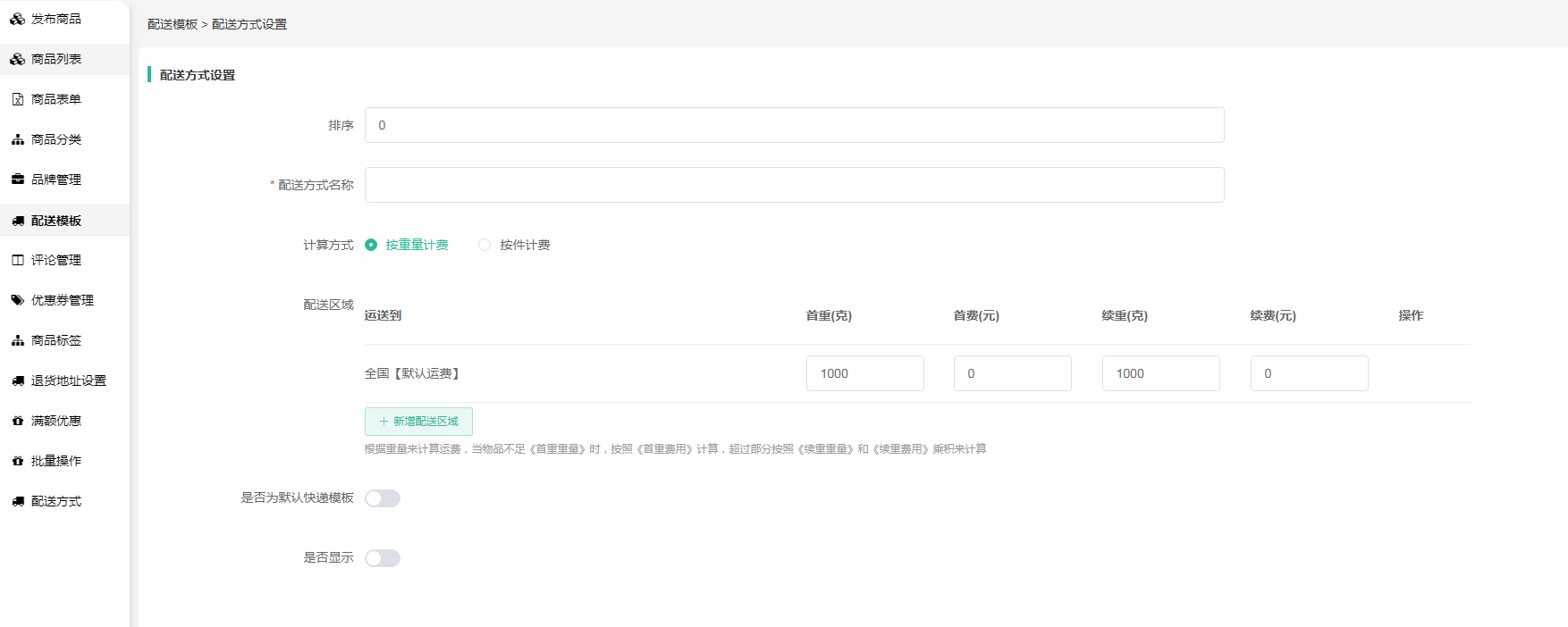 添加配送方式:支持设置多种不同配送模板,支持按重量计费或者按件计费设置配送模板,配送模板支持设置不同区域不同费用。