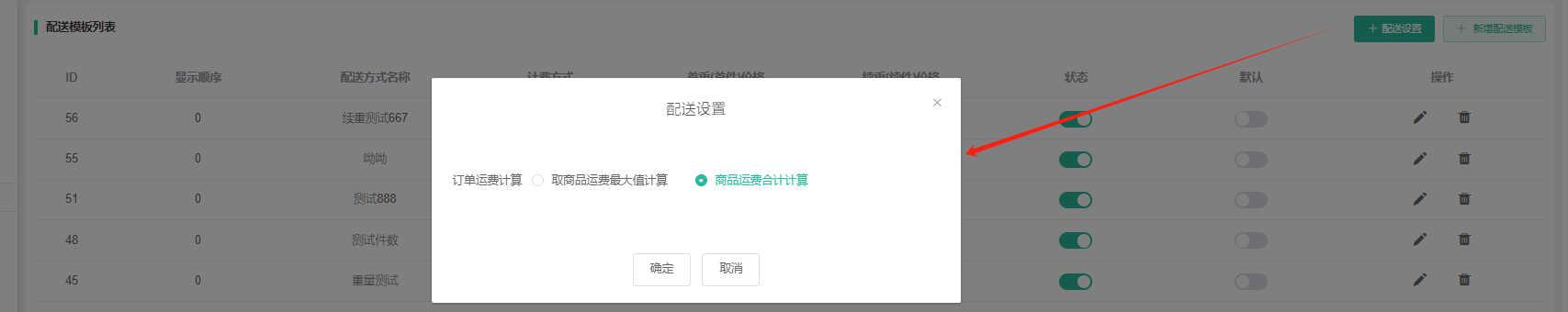 配送设置功能,可以选择去商品运费最大值计算或者商品运费合计计算